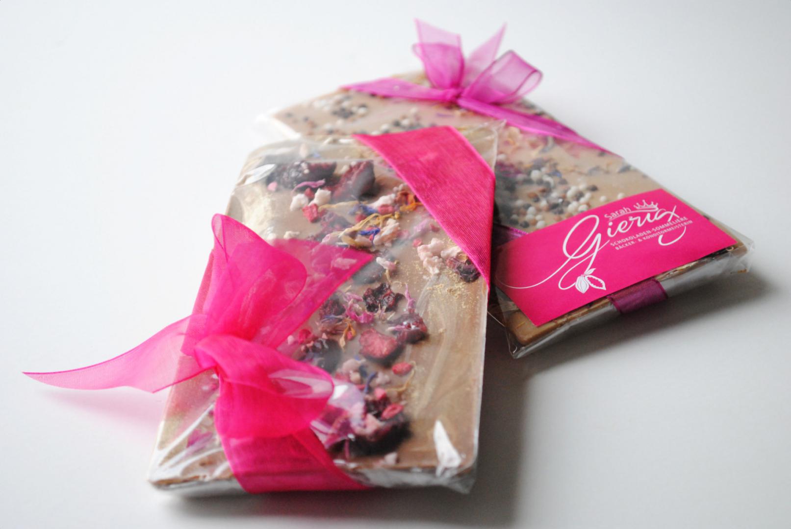Schokoladentafel und Bruchschokolade sind ideale Geschenke für alle Schleckermäuler. Die Sorten können ganz individuell gestaltet und nach den persönlichen Vorlieben von Euch kreiert werden. Der eine mag es nussig, der andere fruchtig oder herb. Der kulinarischen Kreativität sind keine Grenzen gesetzt und erlaubt ist, was schmeckt. Hier findet Ihr eine kleine Auswahl. Jedes Stück ist ein Unikat und wir finden bestimmt die passende Komposition für deinen Anlass. Du hast weitere Fragen? Dann schreib mir eine Mail. Ich freue mich schon von Dir zu hören.